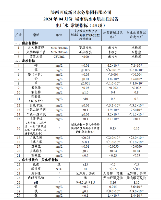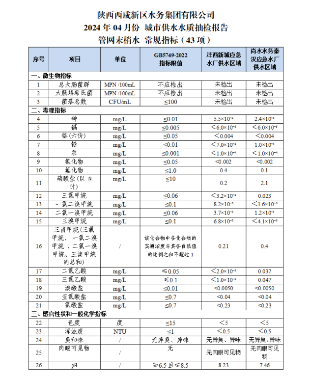 西咸水務(wù)水質(zhì)信息公示報(bào)告(2024年4月)